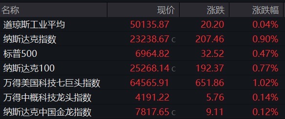 科技股领涨,谈指微涨0.04%,报50135.87点,盘中再创历史新高;纳指涨近1%;标普500指数上升0.5%,靠拢历史高点。