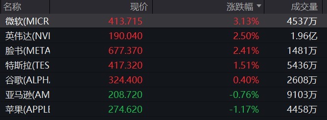 好意思股大型科技股大宗上升,万得好意思国科技七巨头指数涨1.02%。微软涨超3%、英伟达涨逾2%、特斯拉涨逾1%、苹果跌超1%。甲骨文大涨超9%。